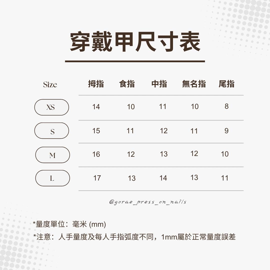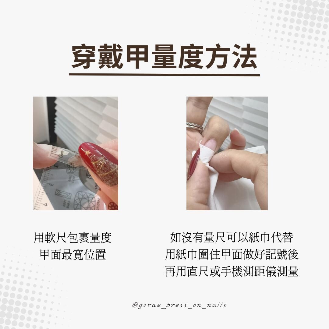 3. 客人收到後,量度返每隻手指相對既size,寫低編號交俾店主(例: 左1,3,5,7,9 右2,4,6,8,10),店主就可以開始為你制作專屬穿戴甲
